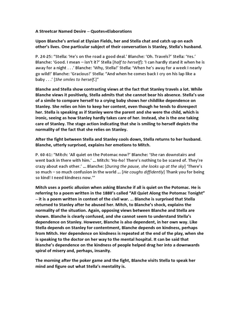 Learn the important quotes in a streetcar named desire and the chapters theyre from including why theyre important and what they mean in the context of the book. Stella notices that blanche is agitated and overwrought and blanche makes numerous references to her nerves. In addition blanches attraction to mitch is mainly motivated by the desire to not be alone rather than an interest in him in particular.